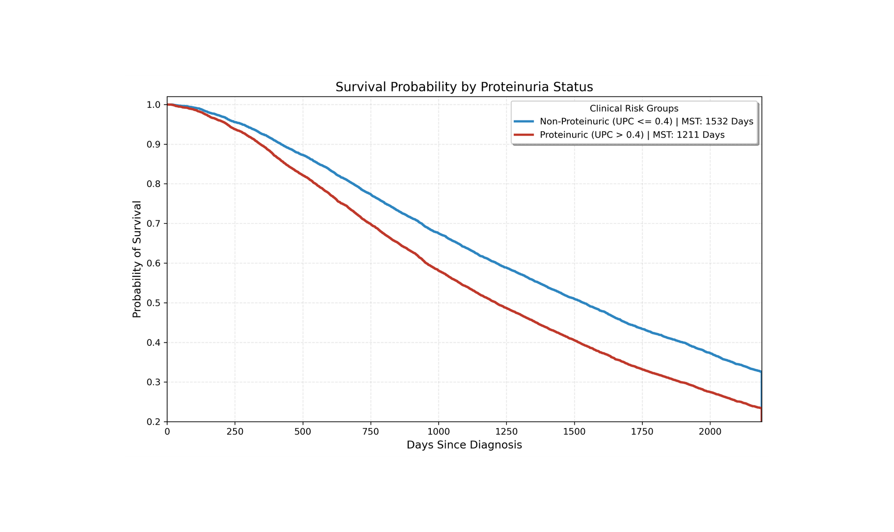 • Proteinuria Penalty: Median survival time (MST) for proteinuric cats is 1,136 days, compared to 1,935 days for non-proteinuric cats.